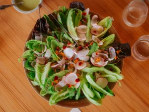 The three-hour event begins under the barn, with offerings of social tonics and provisions boards. Guests are then invited on a 45-minute tour of our farm, sharing insight into the care and dedication that go into every aspect of what we do, followed by an optional walking mindful meditation. Just before sitting down in the open-air barn to a multi-course family-style meal prepared over wood fire, the chef will provide insight into what has been prepared for that evening. After dinner service, guests are invited to sit around the fire and continue their conversation with new friends.